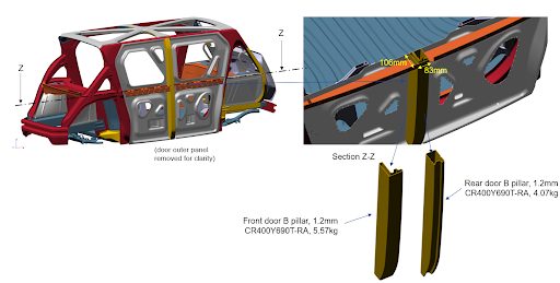 The hydroformed tube utilized for the Steel E-Motive B pillars enabled an integrated part solution, with a 10-15% cost & weight saving compared to a cold-stamped and spot-welded design.