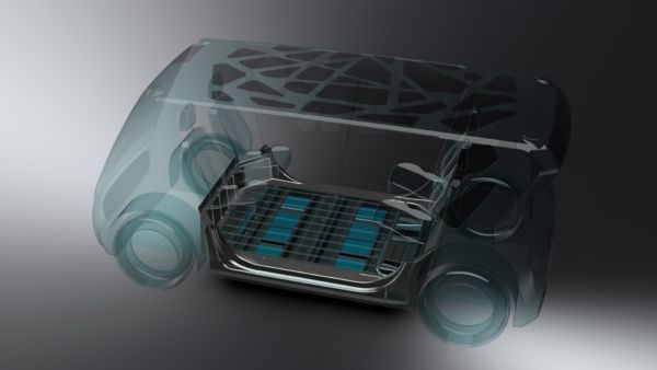 The EV battery packaging is unique. Instead of battery modules mounted to the bottom cover plate, as in conventional designs, they are inverted and suspended in a carrier frame. This frame is attached to the body-in-white structural cross members; a cover plate is then attached to the body in white that encloses and protects the battery pack. This gives significant mass  and cost savings.